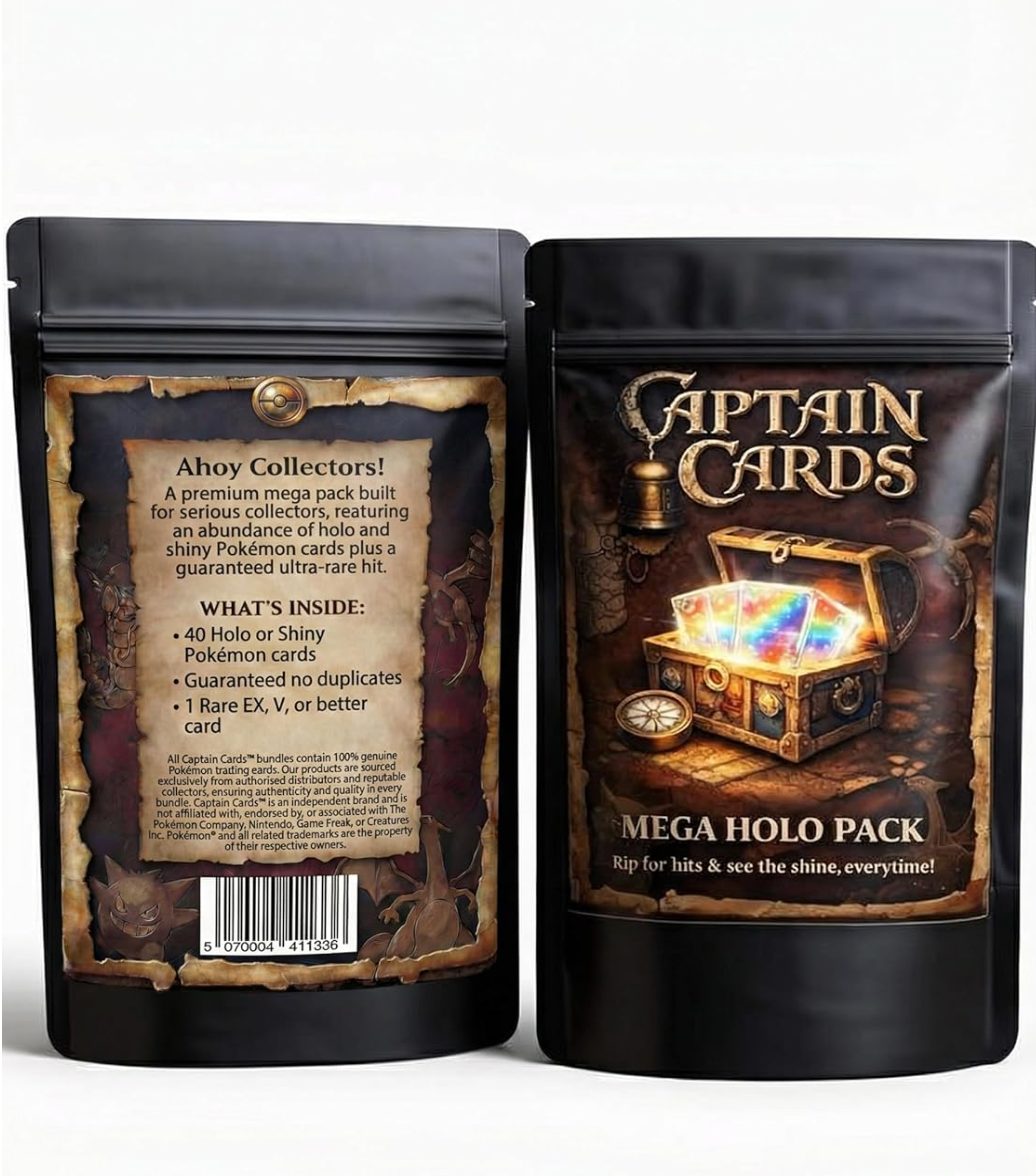 - *MEGA HOLO PACK: This Captain Cards mystery pack includes 40 holographic or reverse holo monster cards plus 1 guaranteed rare EX, V or better card for a total of 41 premium Pokémon trading cards